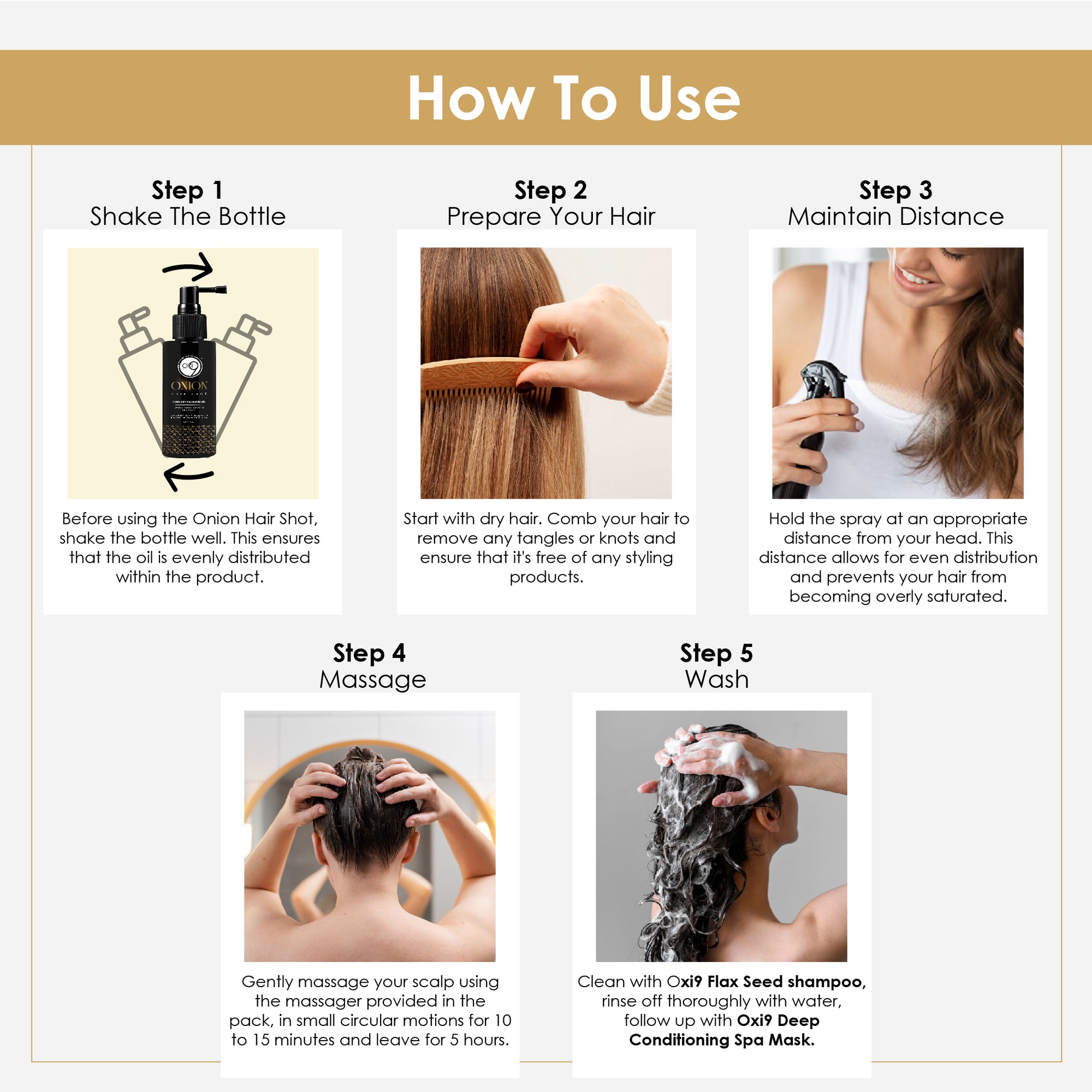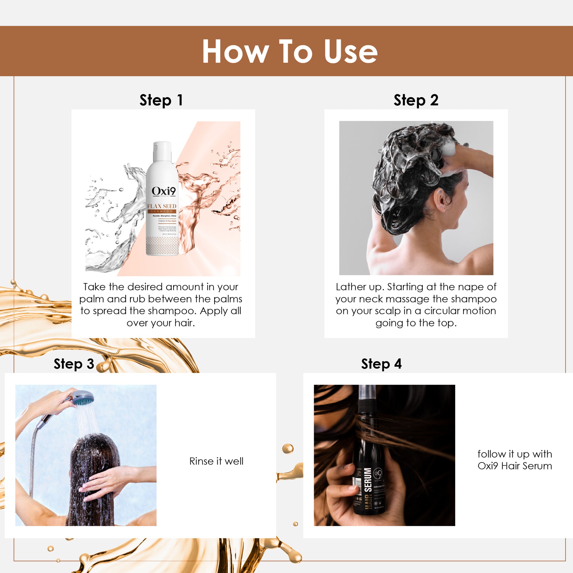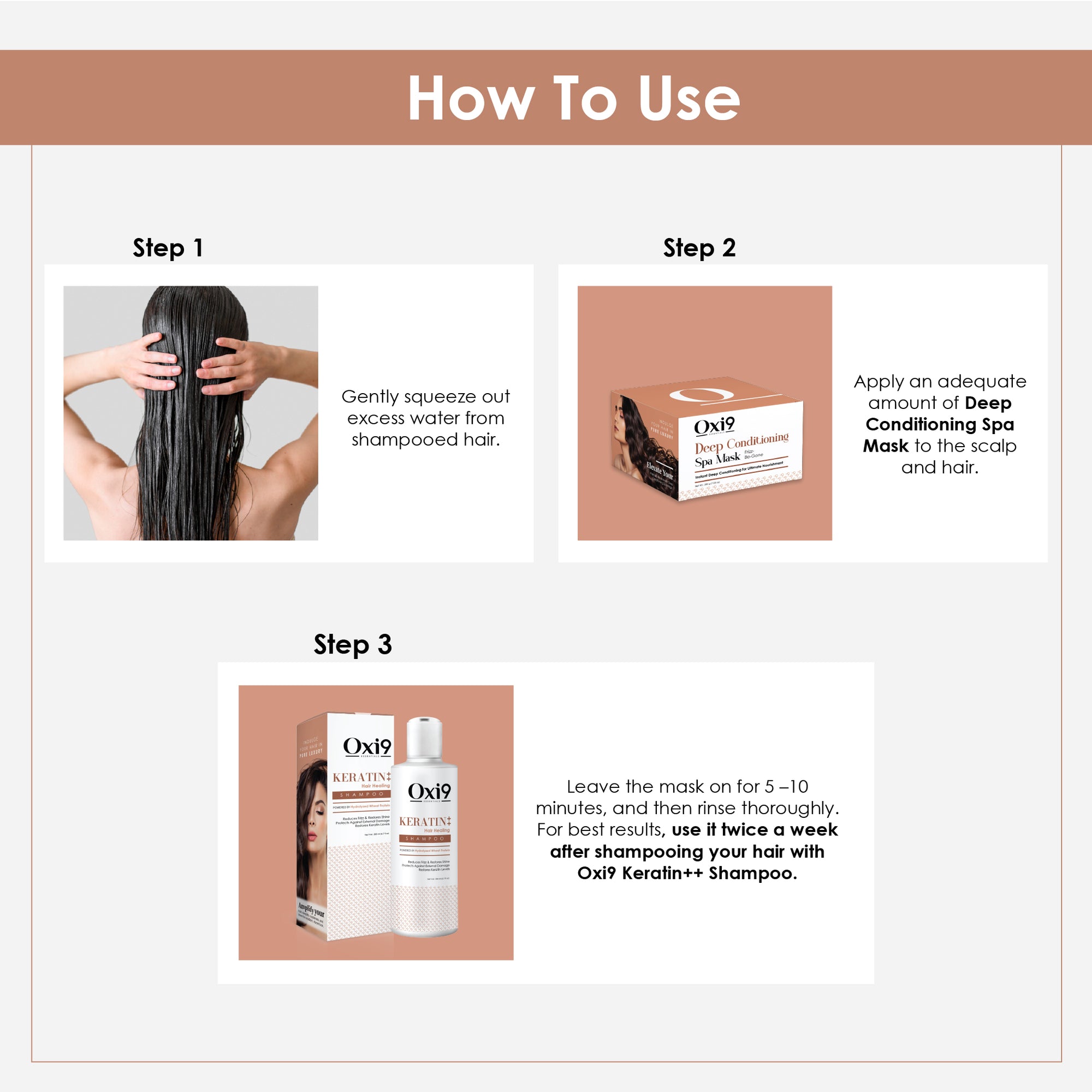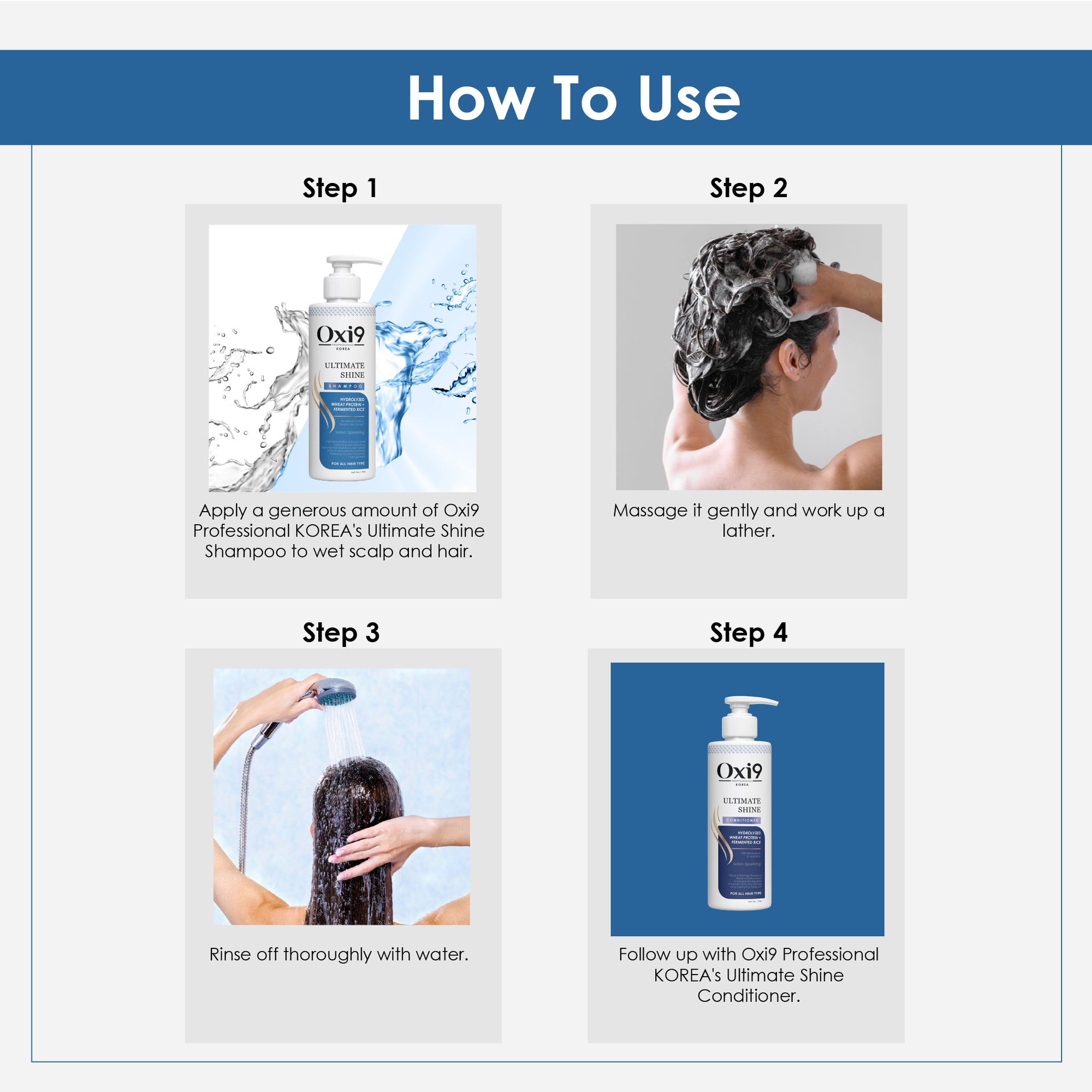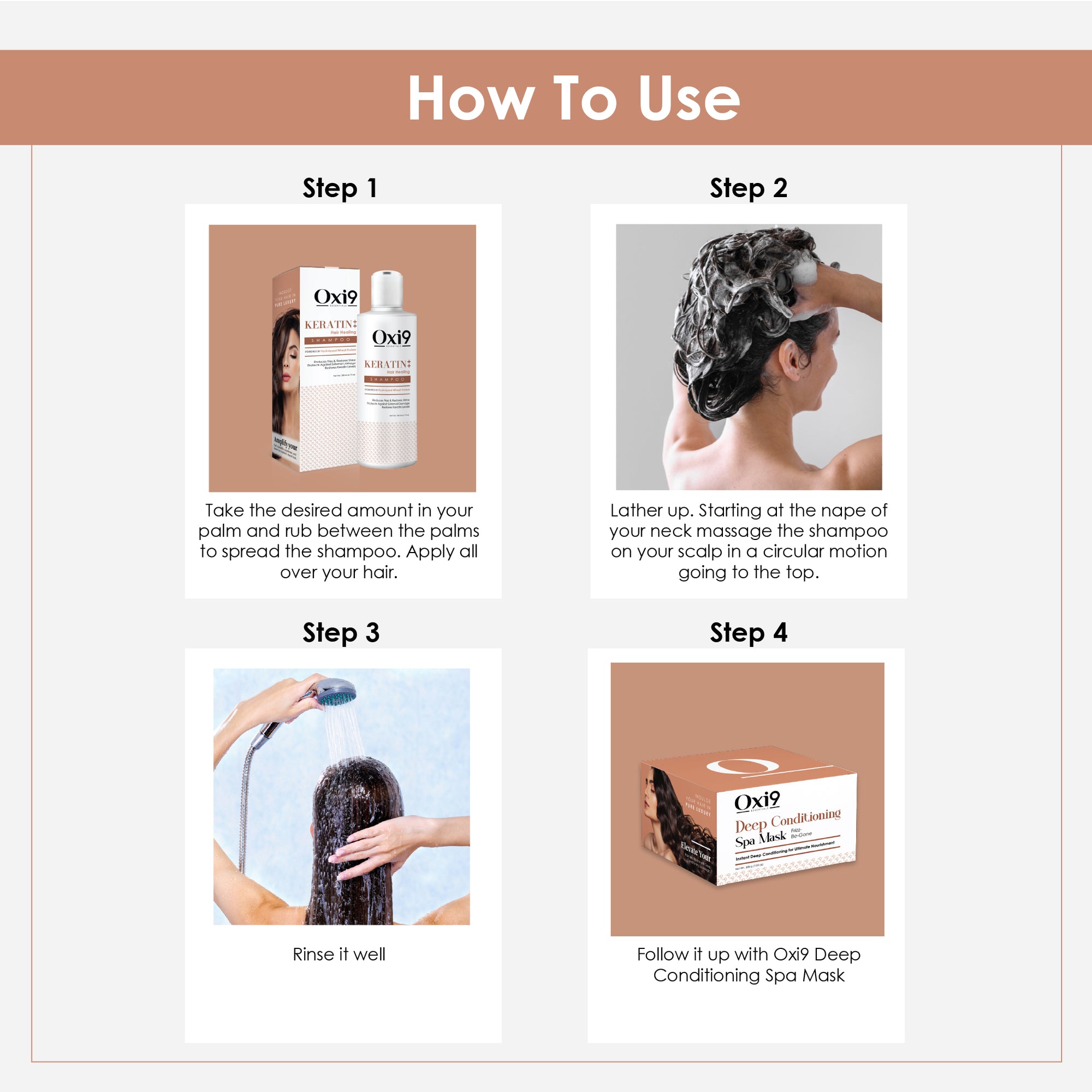 Step 1 – Shampoo: Apply to wet hair, massage gently into scalp, and rinse thoroughly.