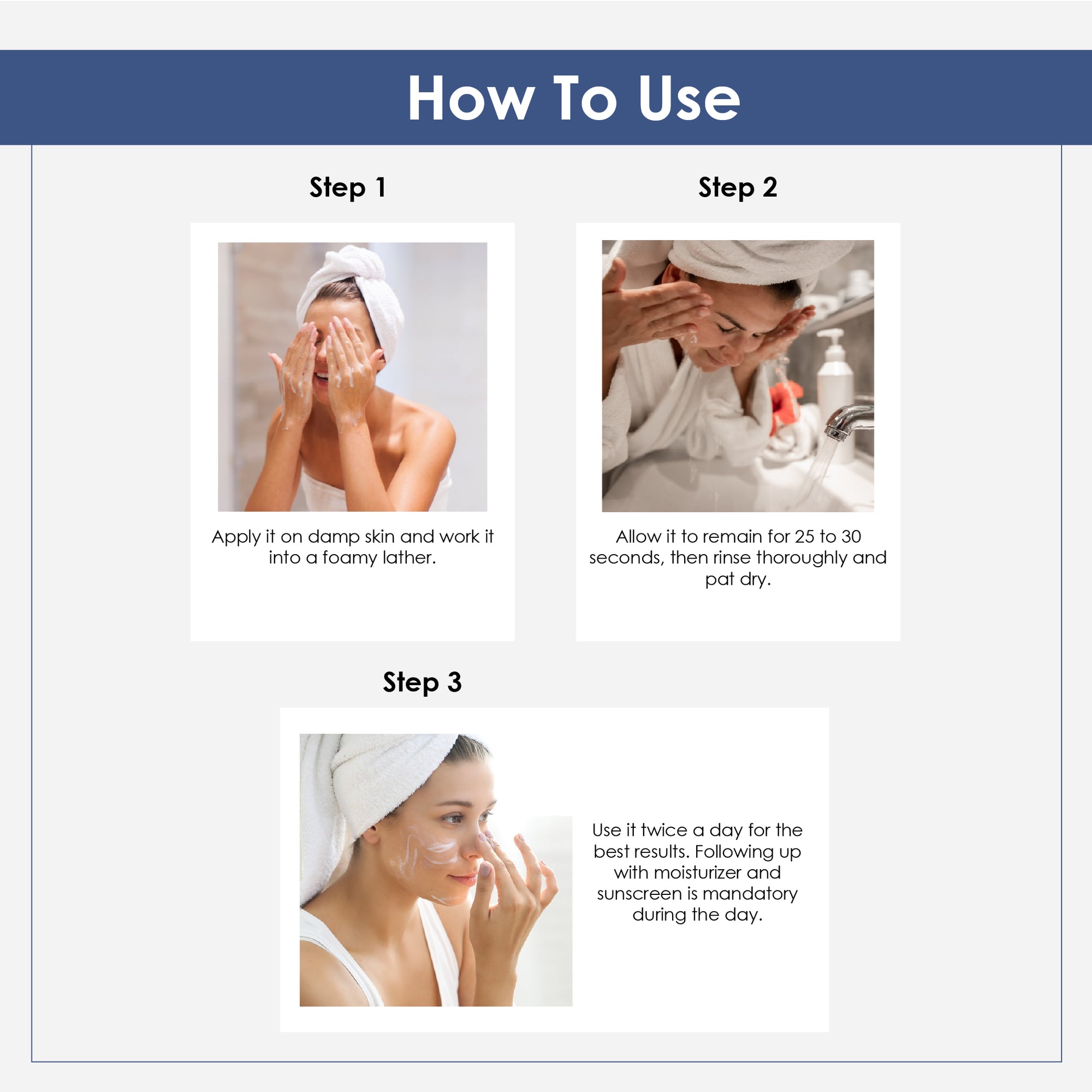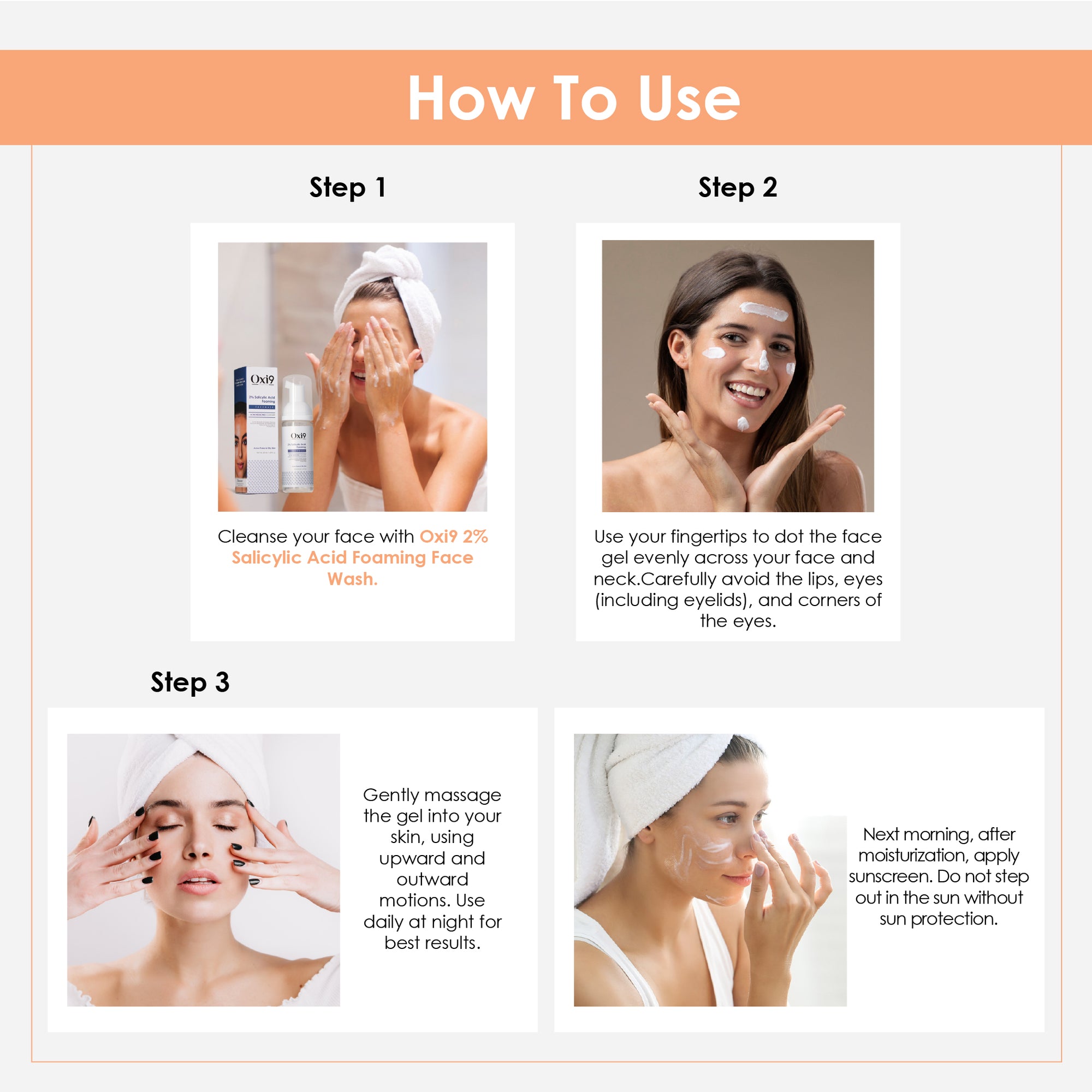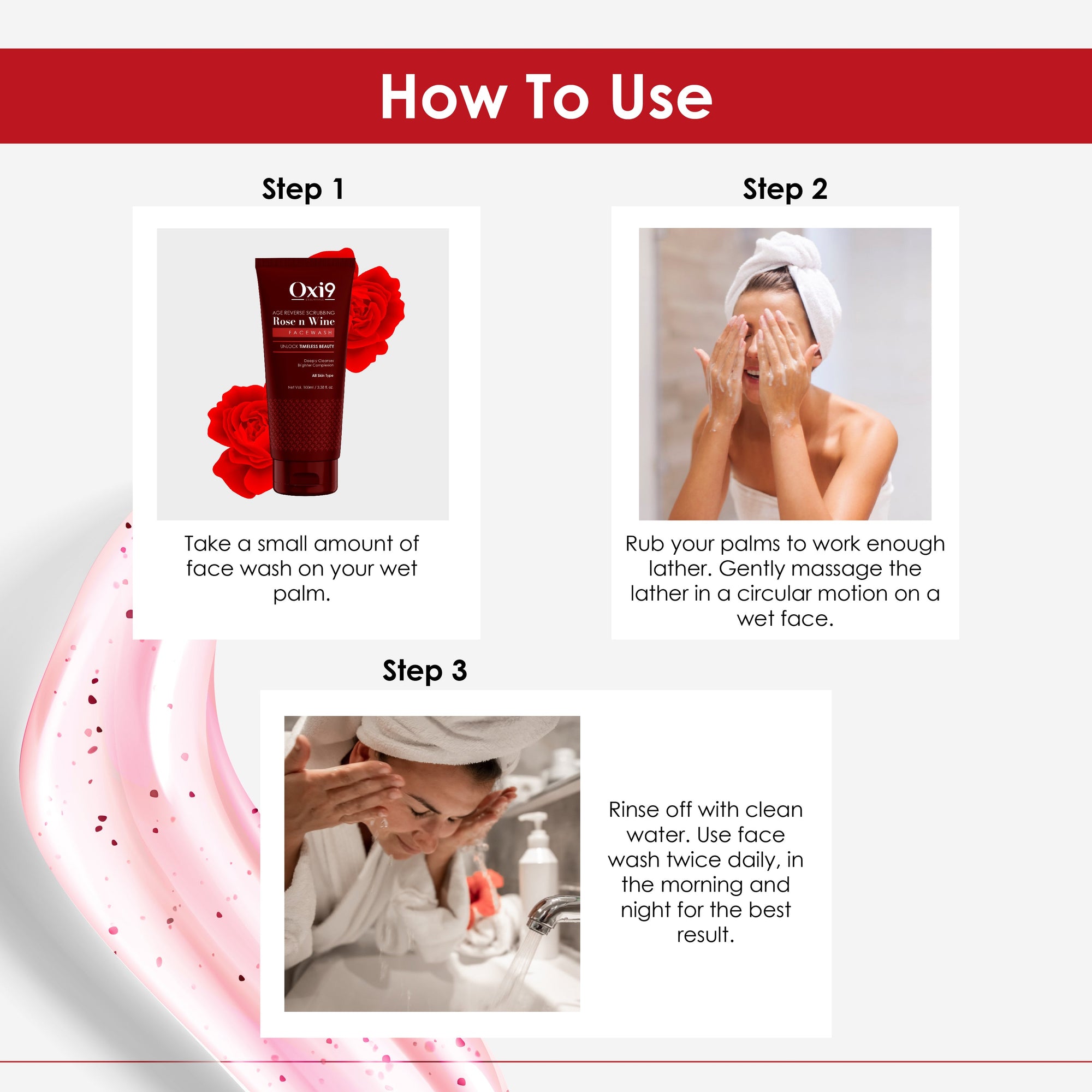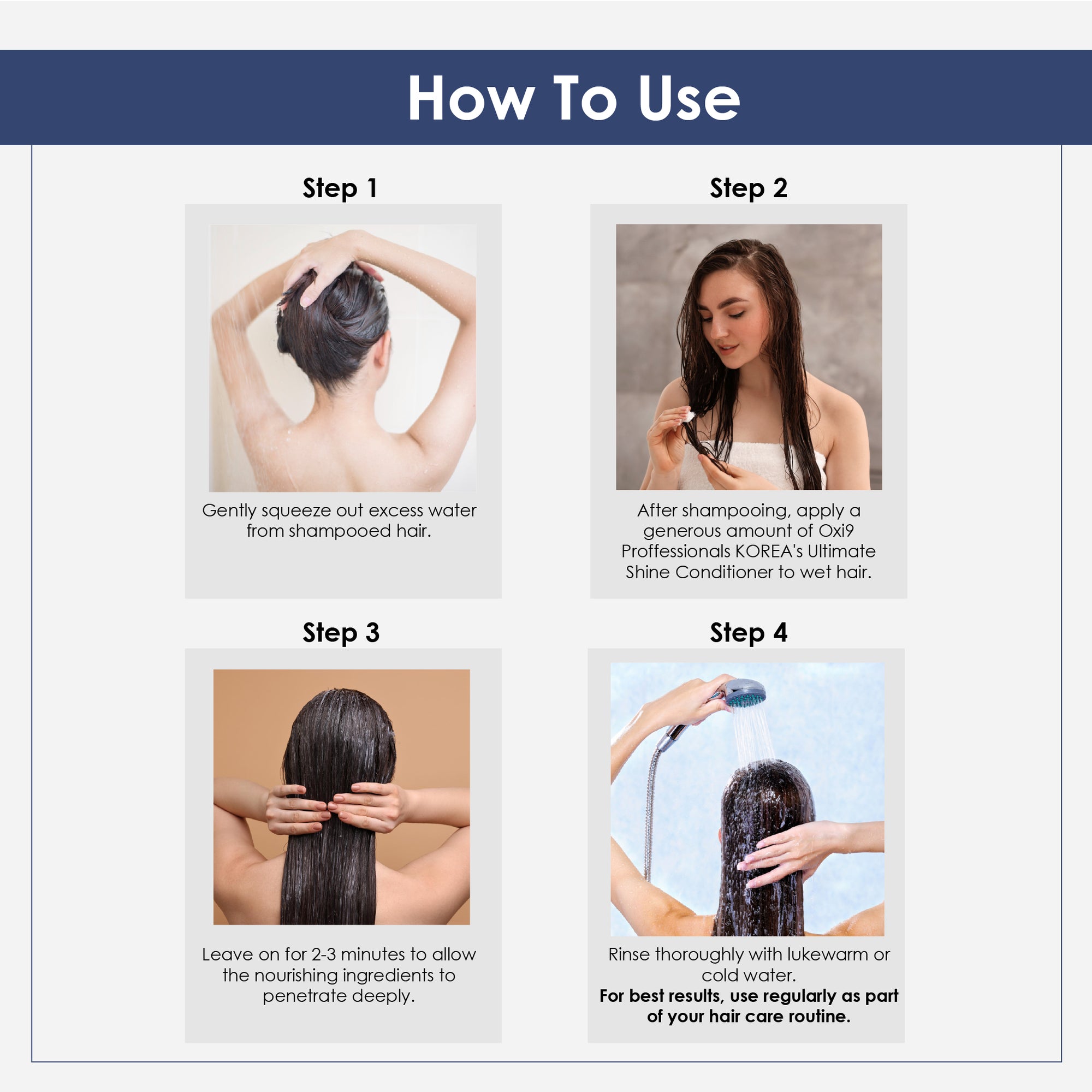 Step 1 – Shampoo: Apply to wet hair, massage gently into scalp, and rinse thoroughly.