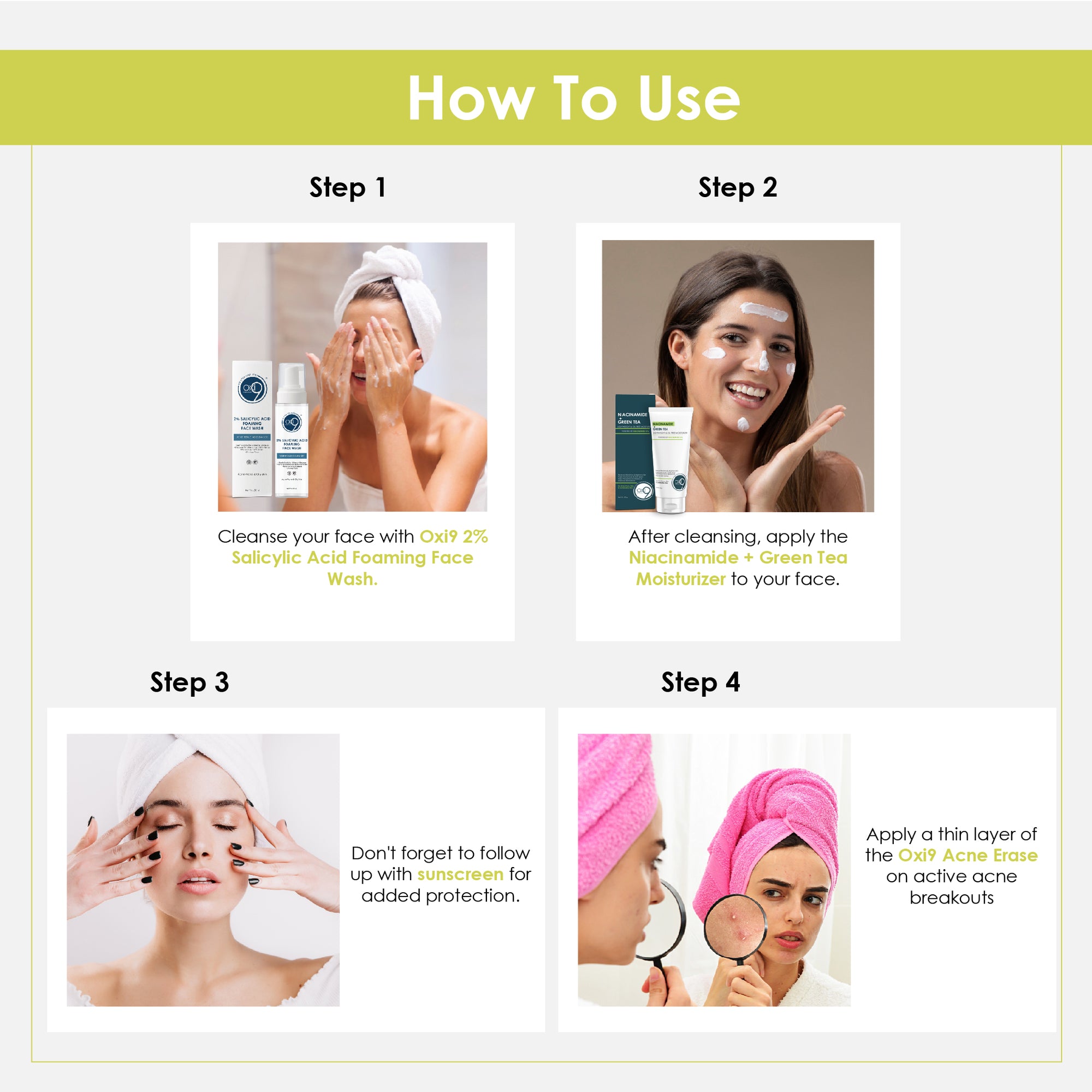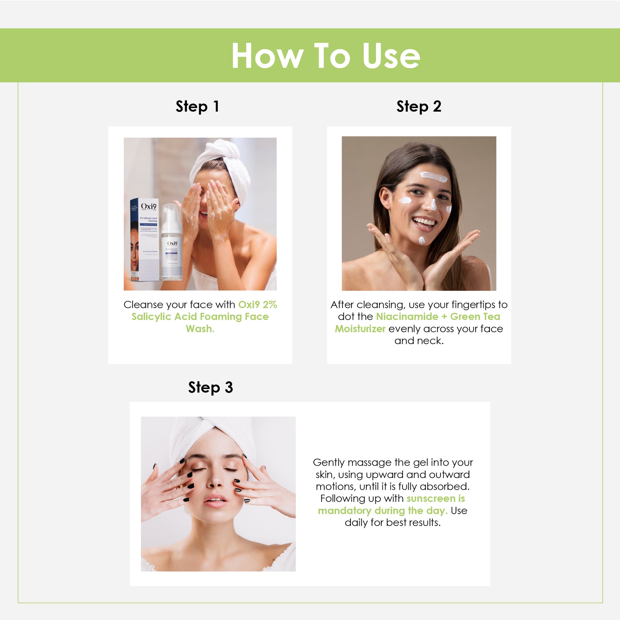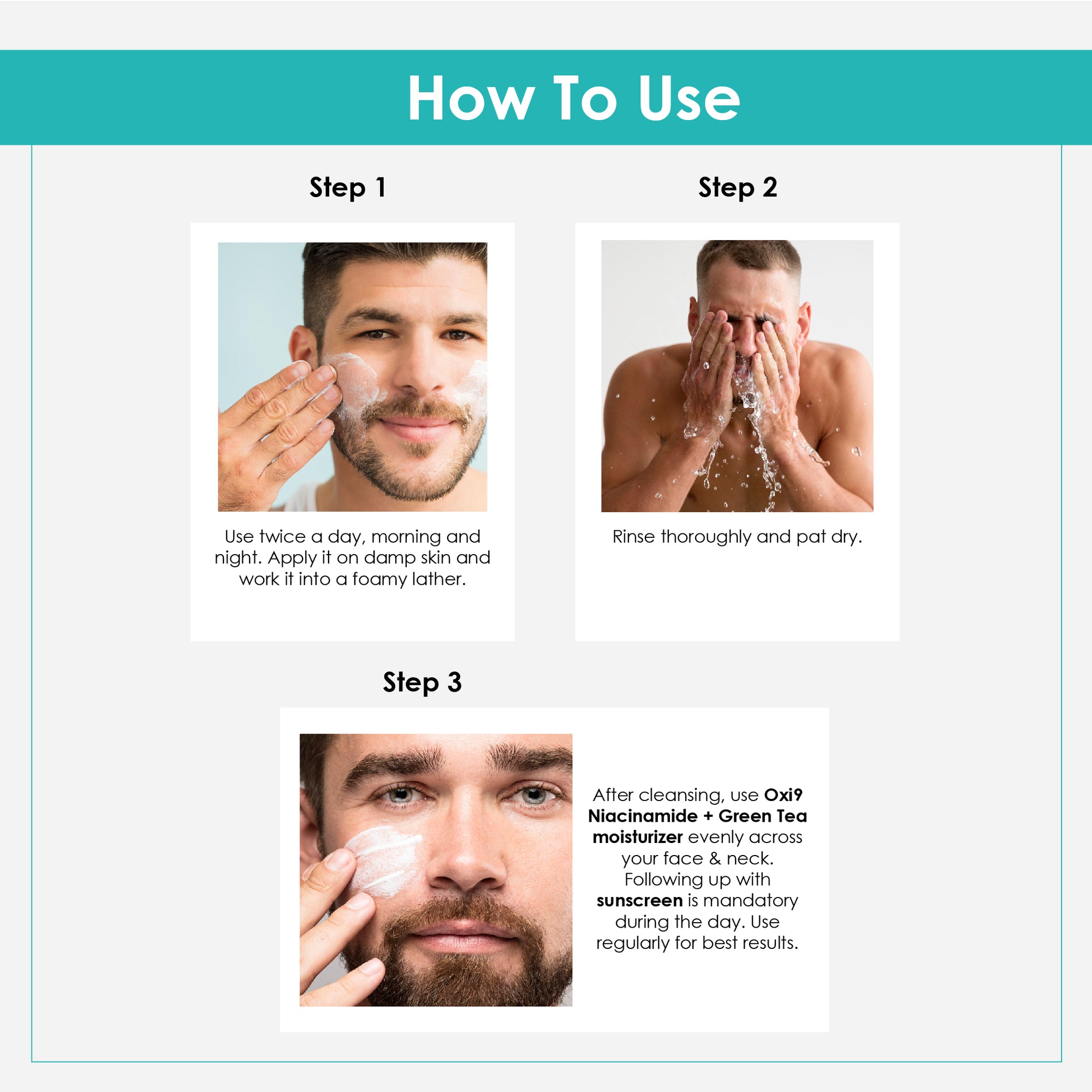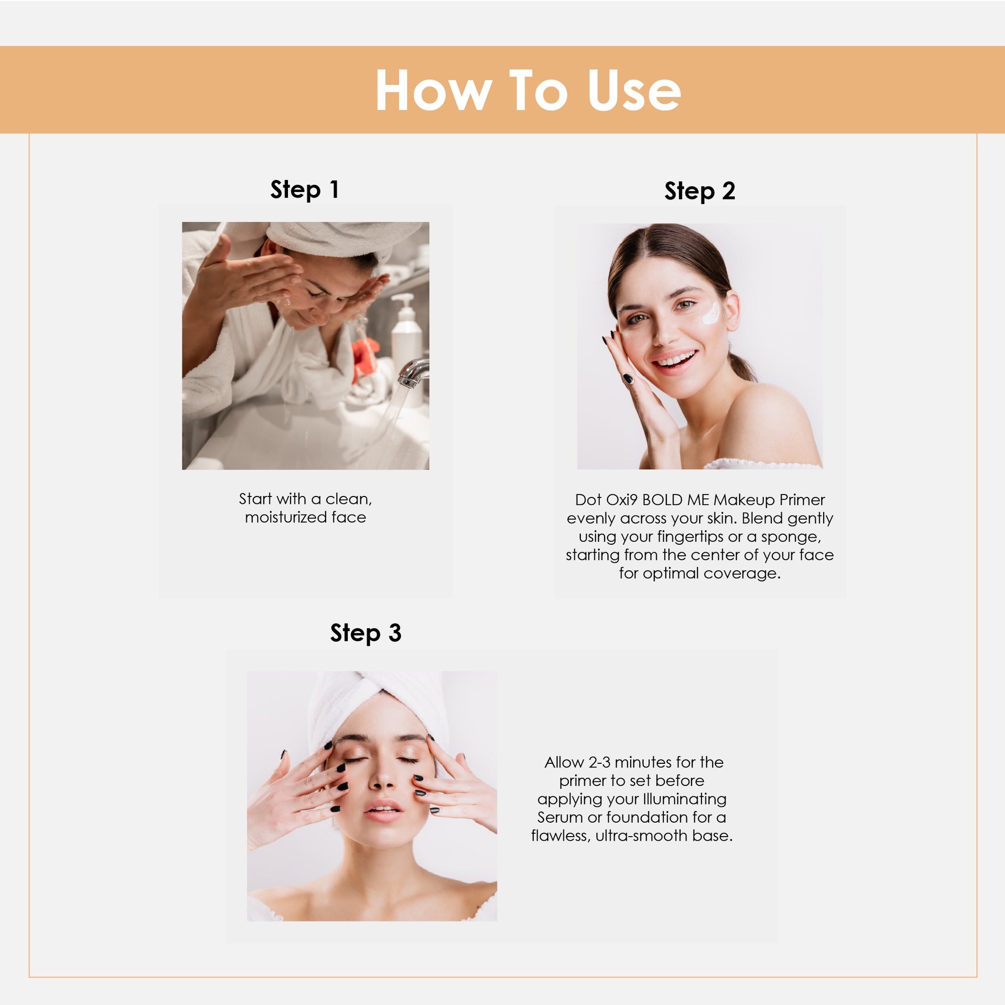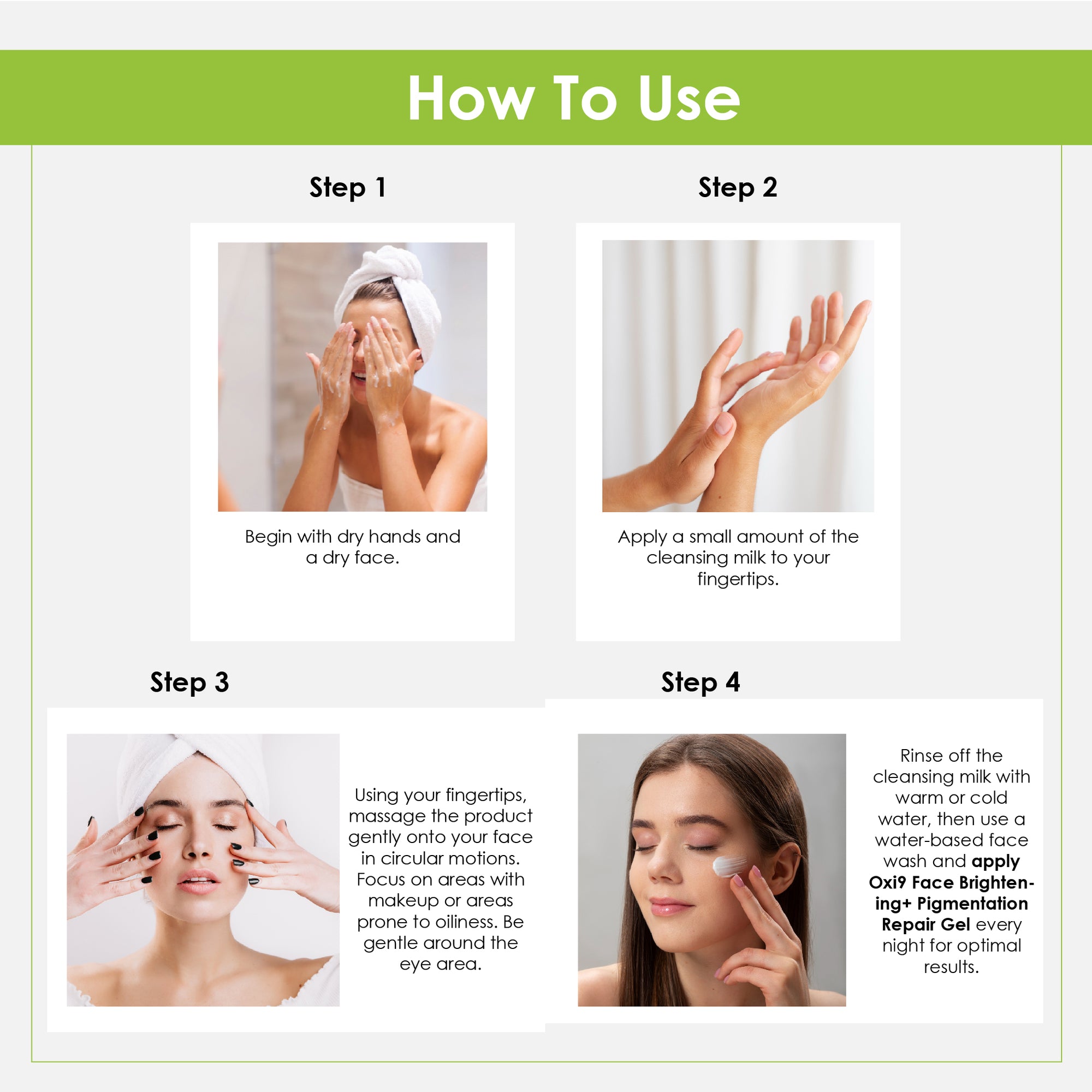 Step 1 – Shampoo: Apply to wet hair, massage gently into scalp, and rinse thoroughly.