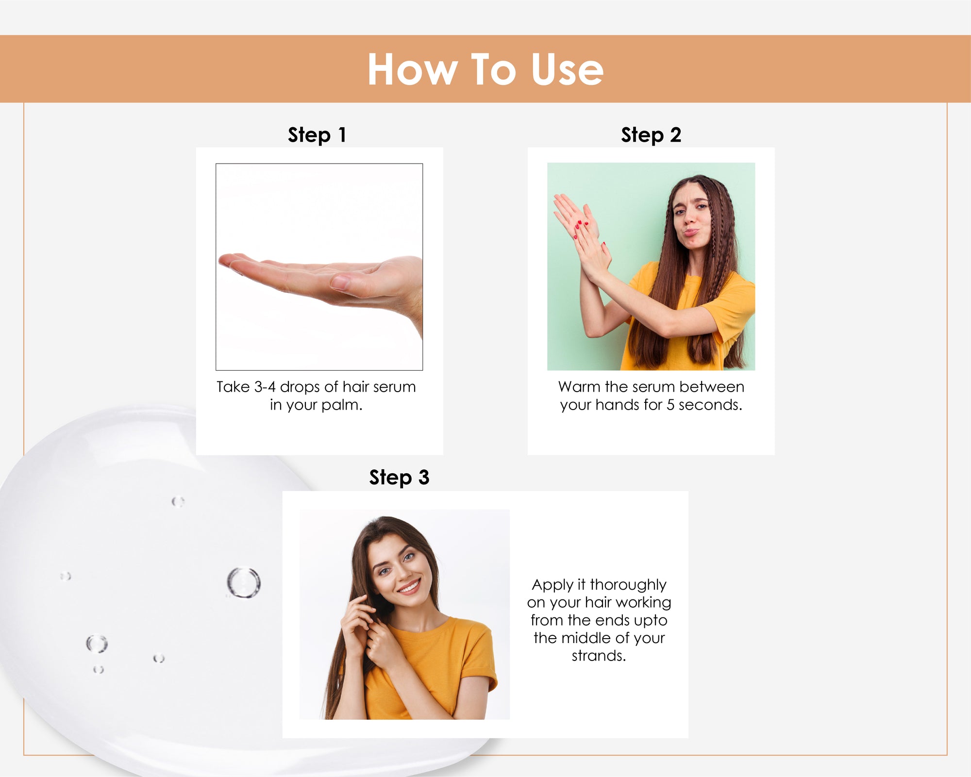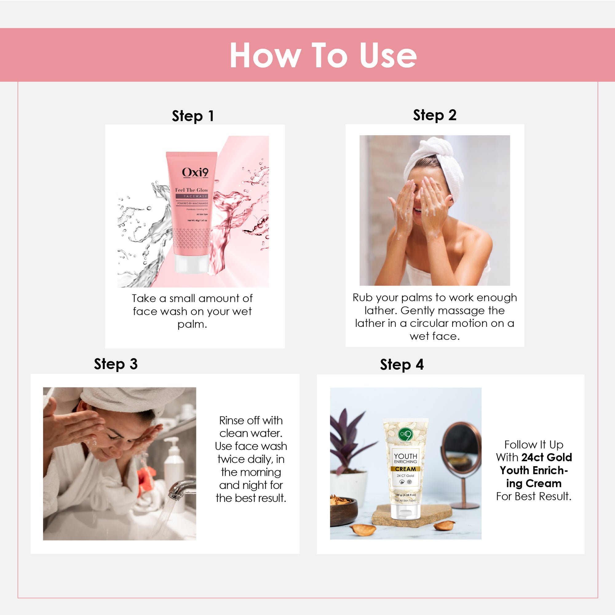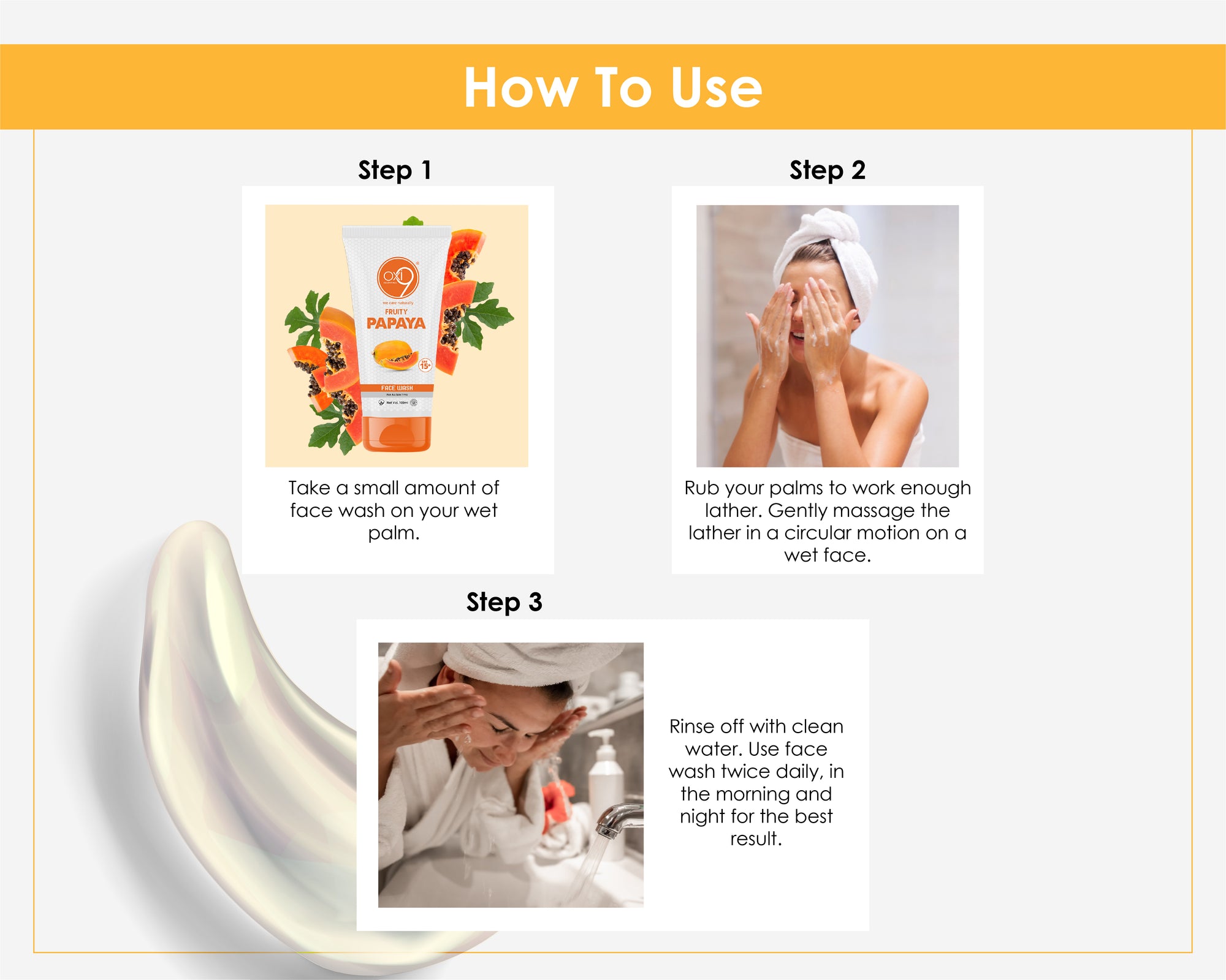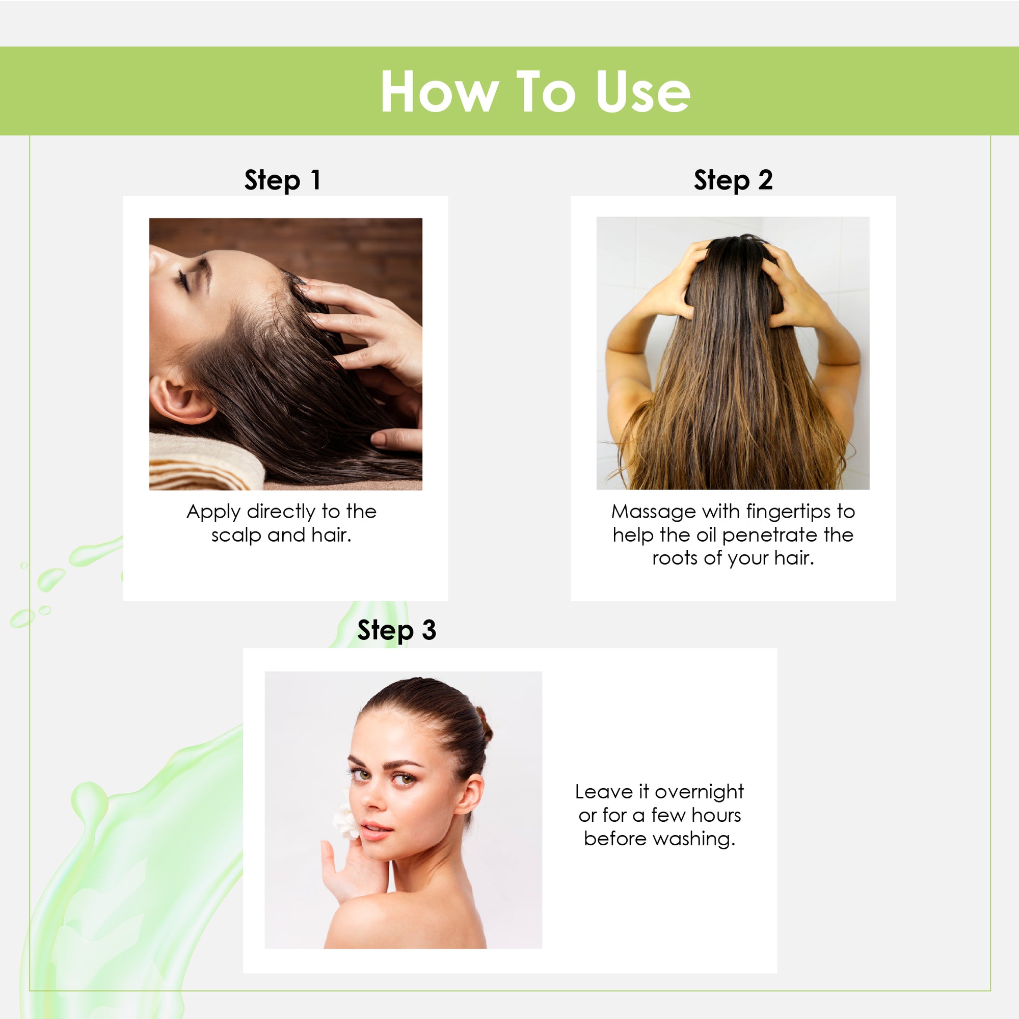 Step 1 – Shampoo: Apply to wet hair, massage gently into scalp, and rinse thoroughly.